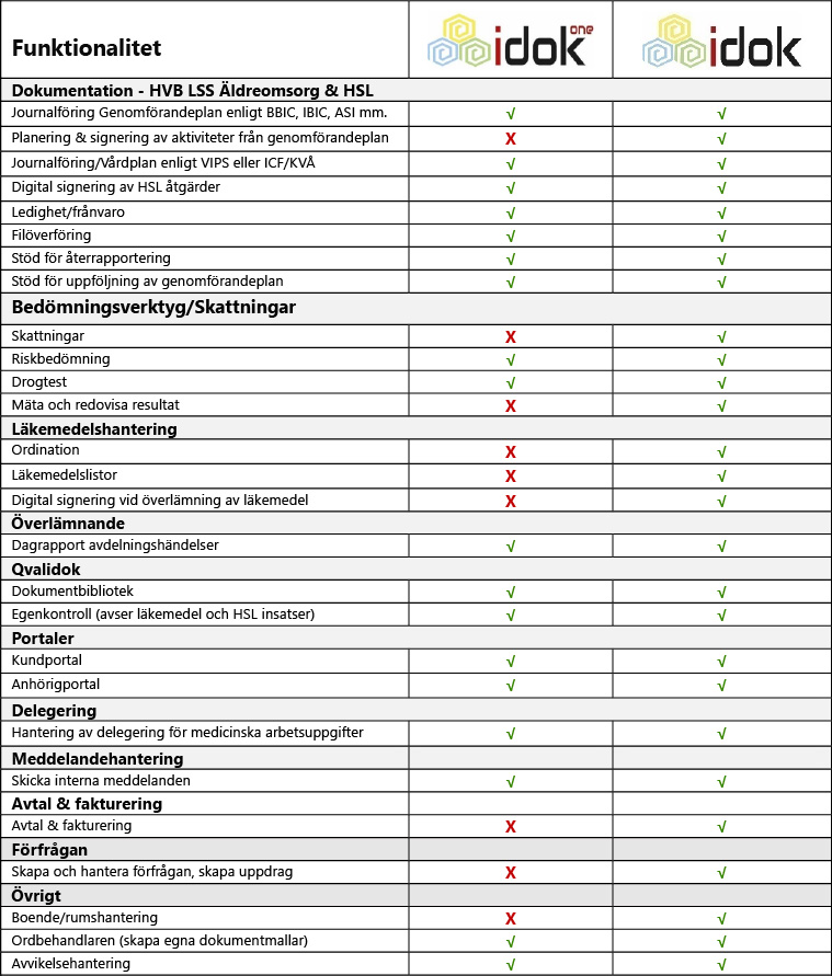 Notera att tillägg av extra funktioner utöver de grönmarkerade i listan ovan inte kan erbjudas i idokOne. Önskas anpassningar eller tilläggsfunktioner skall istället idok beställas.
